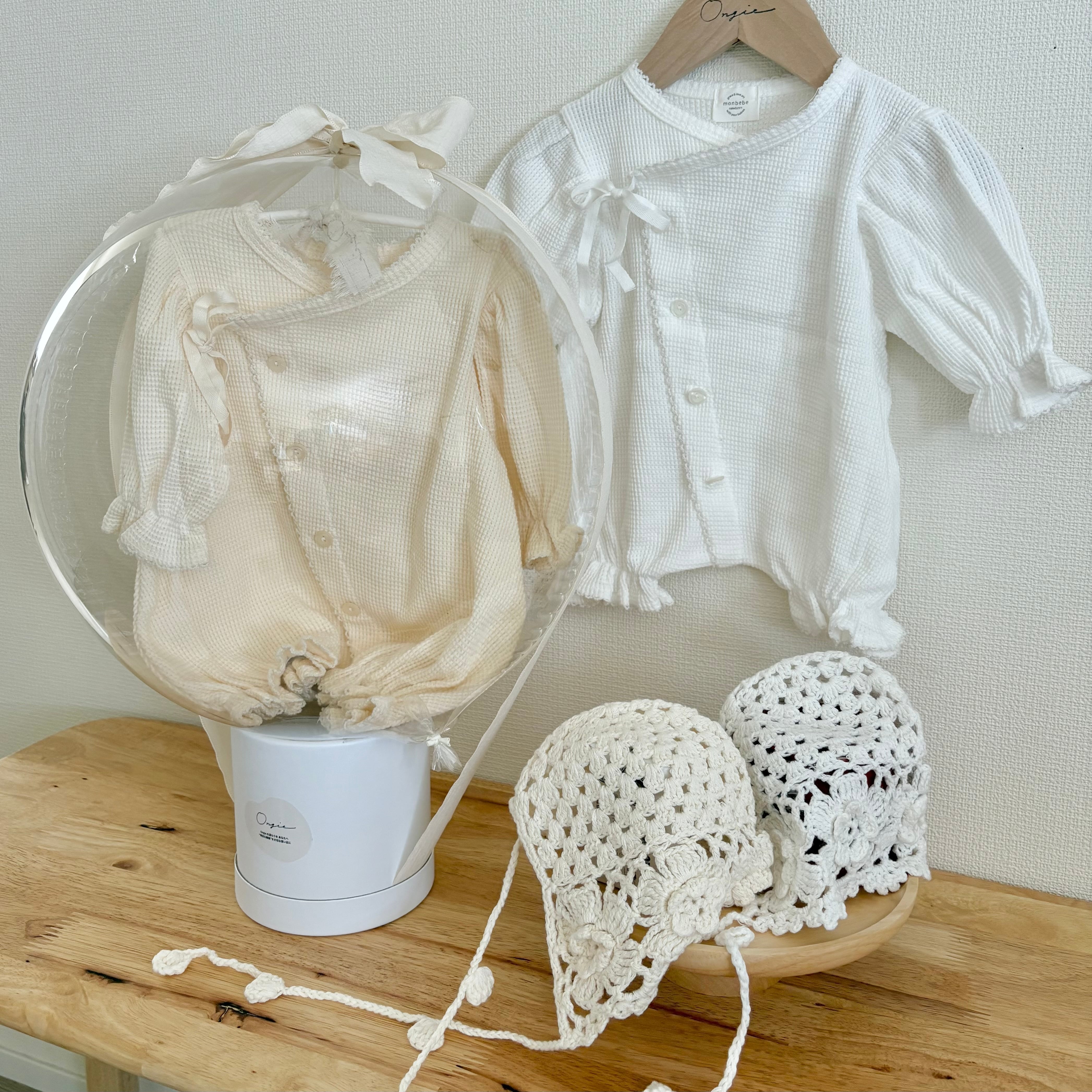 ハンドメイドのボンネットとやわらかなワッフルロンパースのセット。monbebeの中でも特に退院着として人気の高いアイテムです。バルーンを割った瞬間、中から現れる愛らしい姿に、その場が笑顔でいっぱいになるはず♡